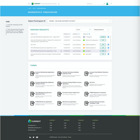 The Membership Onboarding Process is one important process of Euronext since it is the process the Members of Euronext (a big part of its Customers) perform to access the different markets available at the exchange. Since Euronext is first and foremost a Stock Exchange, this process is critical and digitalizing it presented multiple benefits. Mainly reducing the workload and time spent by the members of the MCC (Membership and Customer Connectivity) Team and improving the User Experience of the customers or the Customer Experience.